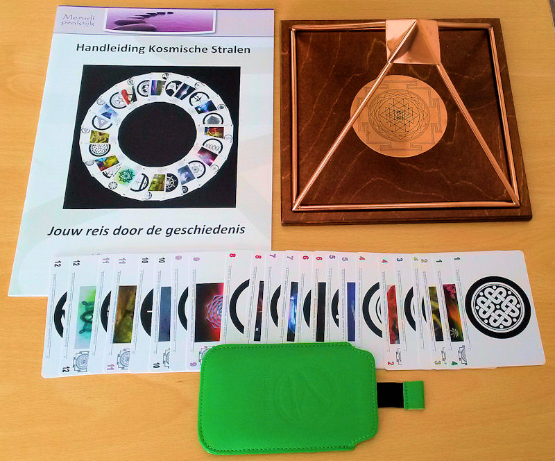 Ideaal voor uw eigen praktijk: Grote koperen piramide, volledige set van 28 stralen kaarten, iconen en afbeeldingen, op keycard formaat inclusief hoesje en handleiding.